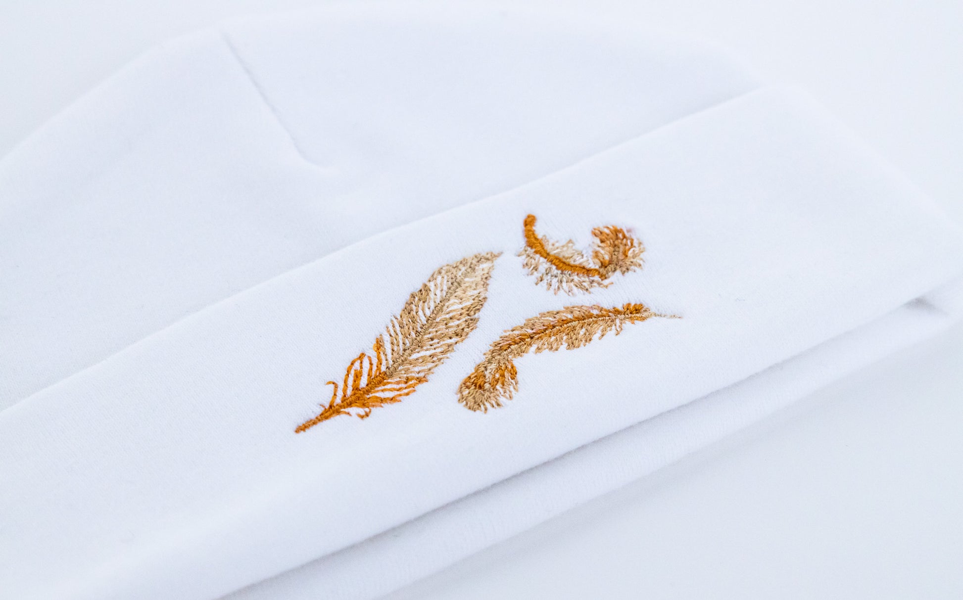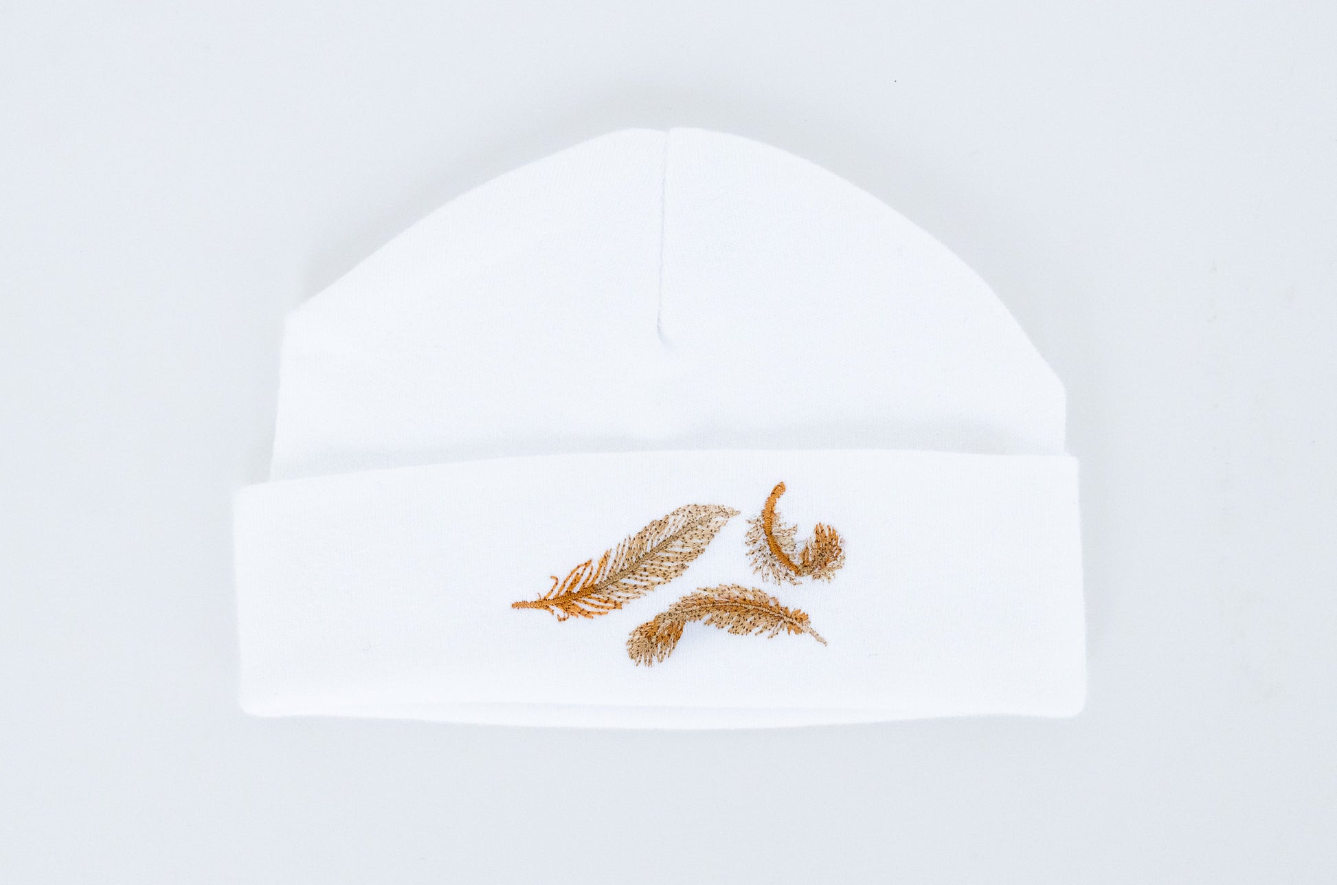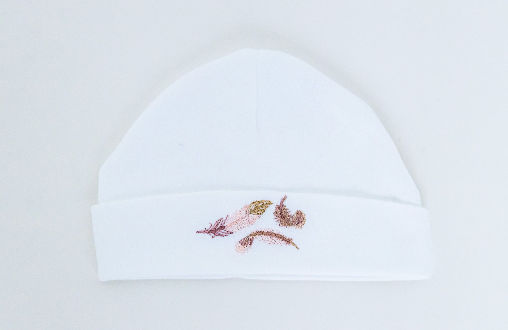 The sweetest finishing touch for any outfit, our Feather Beanie is embroidered in England with our delicate floating feather motif, available in gold, pink, or blue thread.