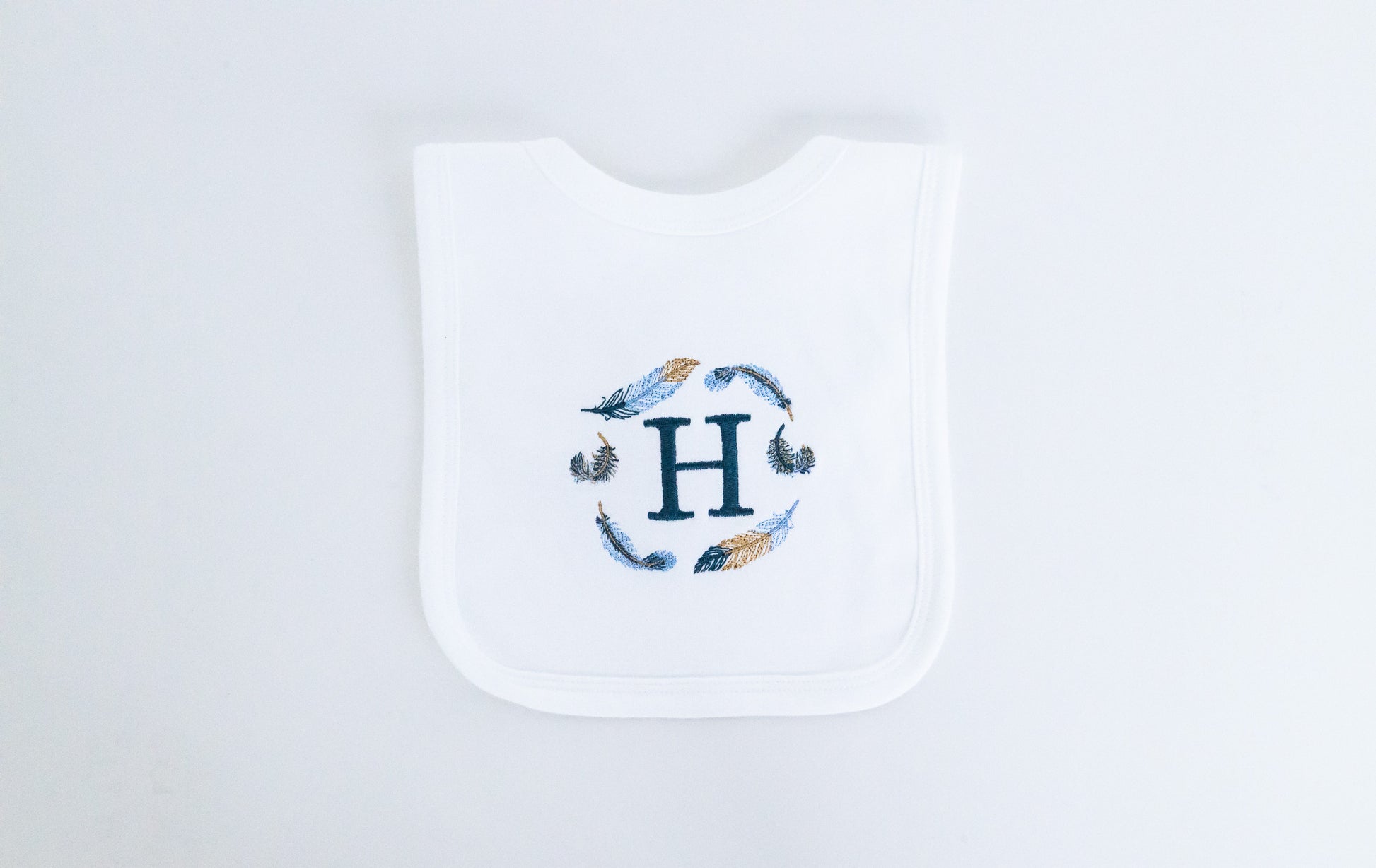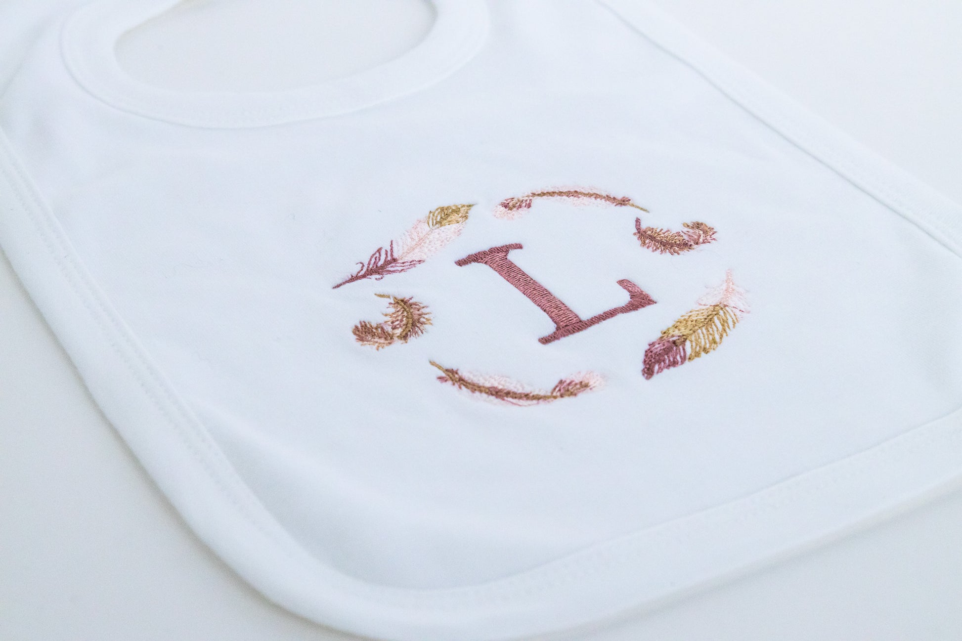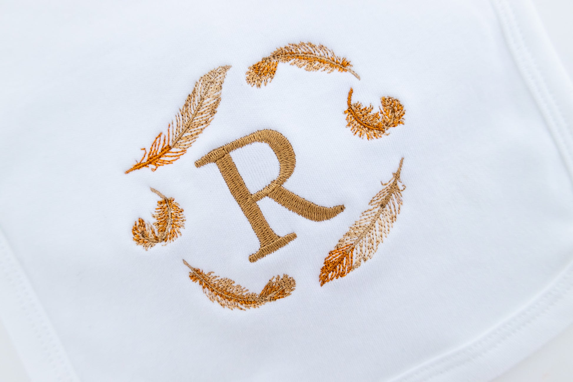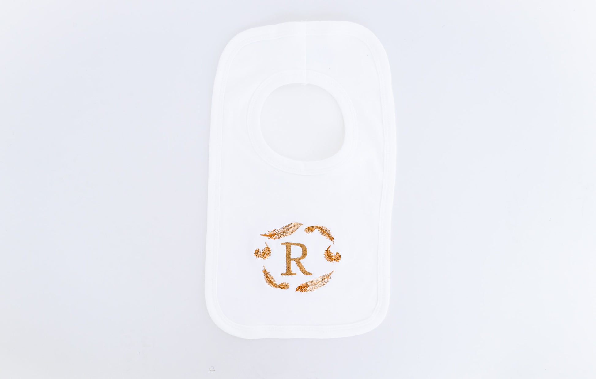 As practical as it is beautiful, our personalised bib is designed to keep little outfits safe from spills while adding a touch of elegance to every mealtime. Each bib is embroidered in England with your baby’s initial, delicately framed by our signature floating feather motif.